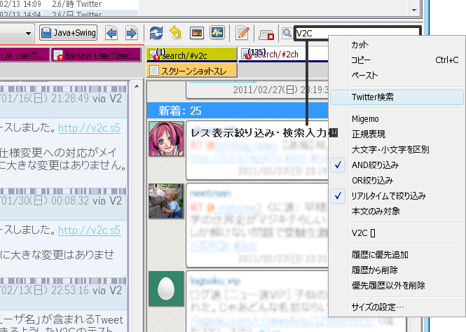 レス表示絞り込み・検索入力欄のポップアップメニュー(右クリック)からTwitter検索を利用することができます。