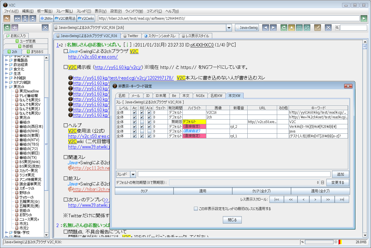 スレッド非表示・キーワード設定では、スレ一覧において任意の文字列を含むスレタイを、非表示(NG)にすることができます。