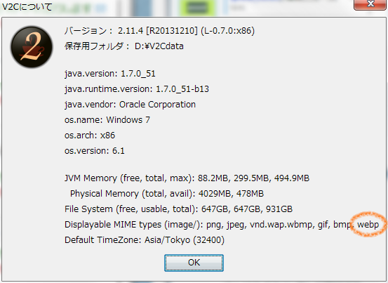 「ヘルプ」メニュー「V2Cについて…」を開き、Displayable MIME types に webp があればWebPの表示が可能です。