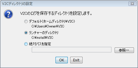 V2Cの初回起動では次のようなダイアログが現われます。ここでは「OK」を選んで下さい。