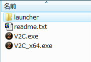 32bit版OSであればフォルダの中にある"V2C.exe"を、64bit版OSであれば"V2C_x64.exe"を実行することにより、V2Cを起動することができます。